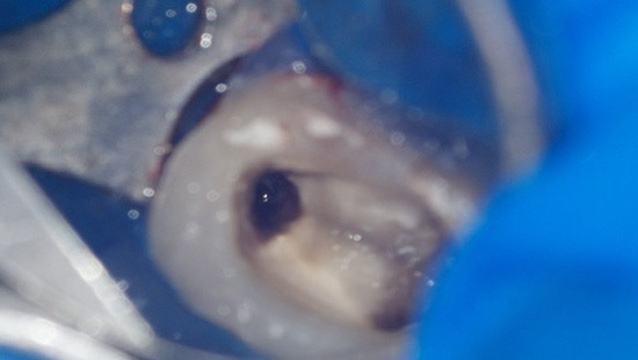 マイクロスコープを用いて高倍率で確認すると、1本の根管と思われていた部分が、途中から枝分かれして2本となっていました。