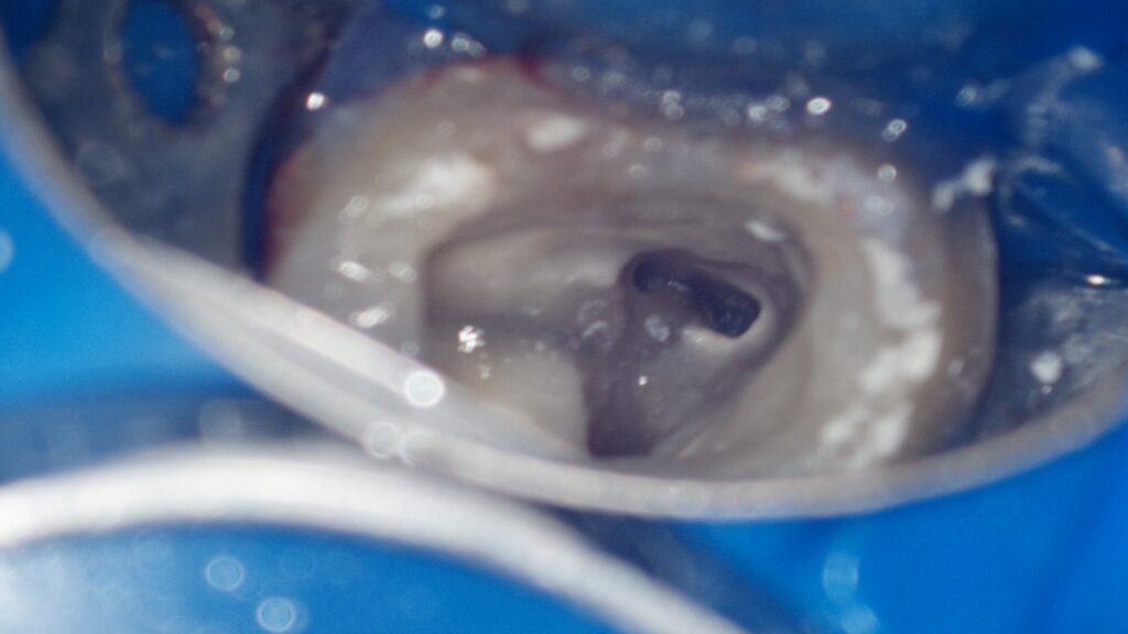 根の中をマイクロスコープで確認し、歯根の破折は確認できなかったため、精密根管治療により歯を保存することとしました。