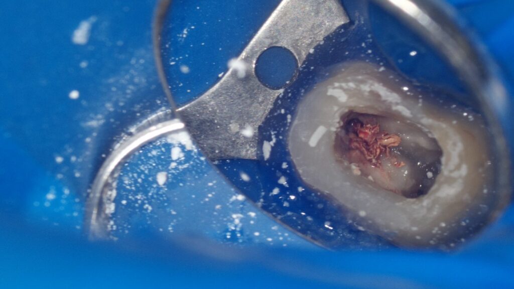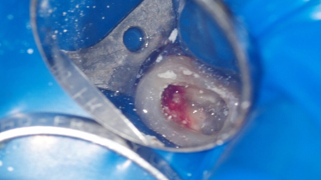 根の中をマイクロスコープで確認し、歯根の破折は確認できなかったため、精密根管治療により歯を保存することとしました。