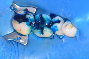 むし歯を染め出す青い液を用いて、むし歯の部分を取り除きます。