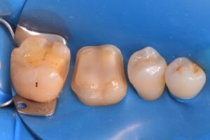 むし歯を除去した後は歯の形がボコボコとスムースな形をしていないことが多く、そのままでは修復物の適合が悪くなるため樹脂を用いて滑らかな面とする必要があります。また、むし歯を削った後の歯の表面を樹脂を用いて保護する目的もあります。