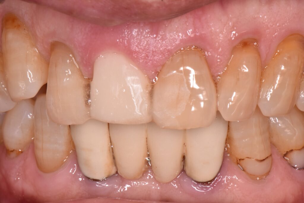 抜歯と同日に仮の歯を入れることで見た目の改善を図っています。この時は噛み合わせを全く与えていないため、隣の歯よりも短くしています。